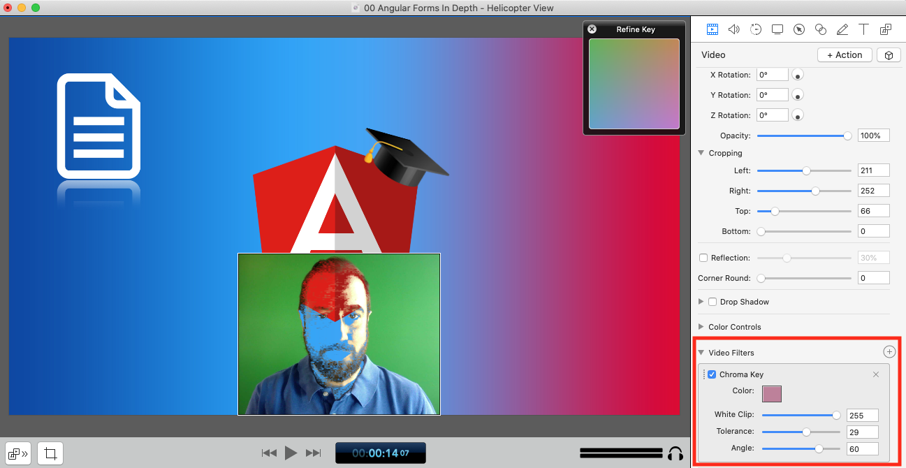 Start by slowly increasing the tolerance, and then slowly adjust the angle. If your screen is well-lit, you should get a perfect green screen effect in no time.