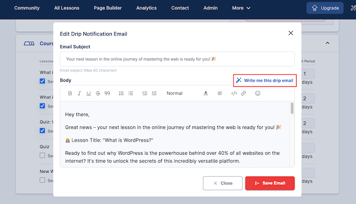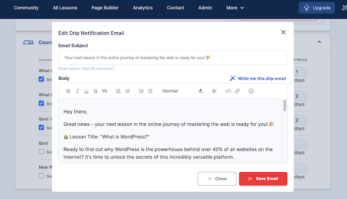 Also, setting up your drip campaign takes some planning and a bit of technical setup, but it's not too hard. Once it's running, you'll be able to guide your students through your course in a way that helps them learn better and keeps them engaged.