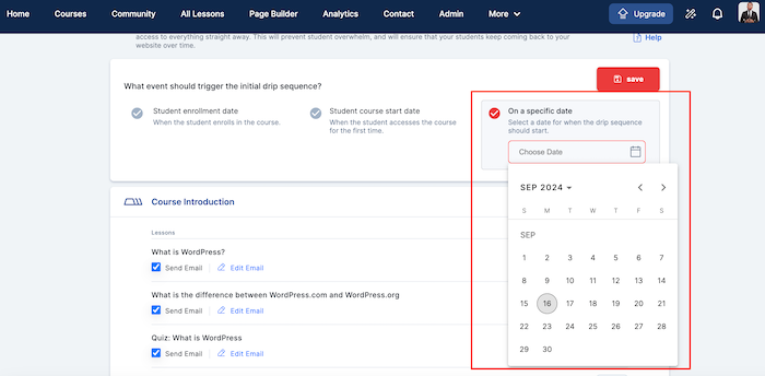 Think of your drip schedule like a TV show. Just as each episode airs on a specific date, you can set exact release dates for each of your lessons. Here's why this is cool: