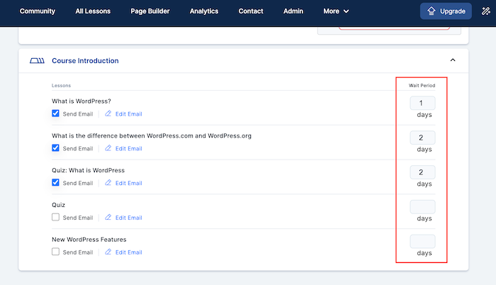- For each lesson, enter the number of days after the start date when you want it to be released.