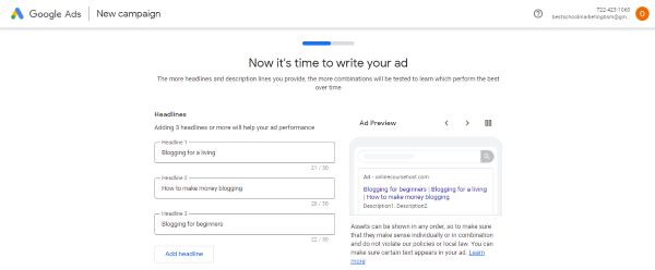 An example of a Google Ad copy for a blogging course may be: