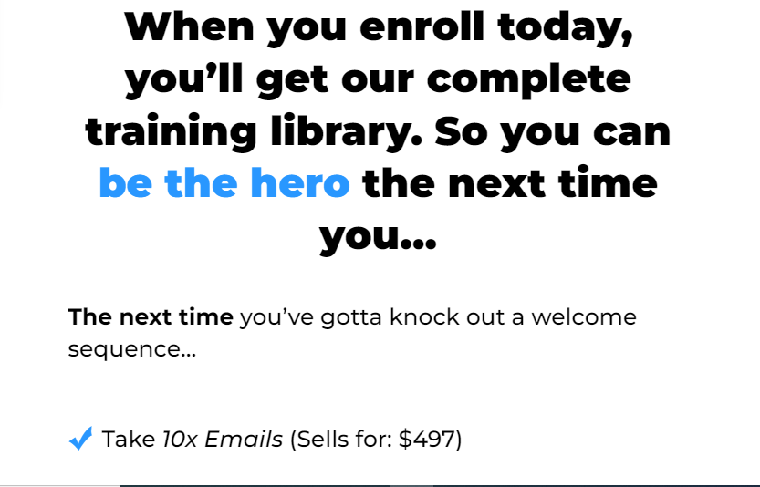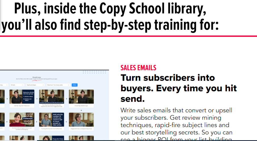 The best part of this page, for me, is the breakdown of the course content, which details each benefit in a clear and compelling manner. This content goes deep into key areas of copywriting, such as sales pages, nurturing emails, funnels, upsells, homepages, and more, with visual representations of each on the page.