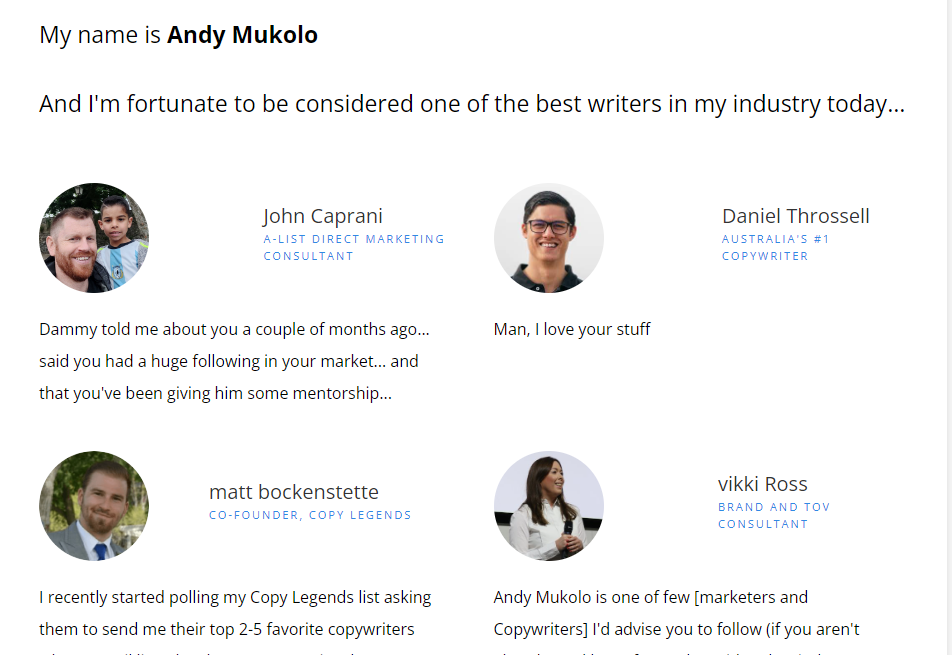 One thing that stands out throughout the page is how Andy backs up each claim with numerous testimonials and proofs to increase credibility.