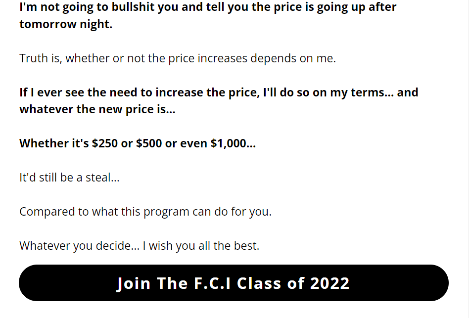 Lastly, the page ends on a strong note with some psychological tricks. He stacks the price to increase perceived value, then adds scarcity to the offer before concluding with an effective call to action. If you are a copywriter looking to upgrade your skills, I highly recommend that you sign up for this program.