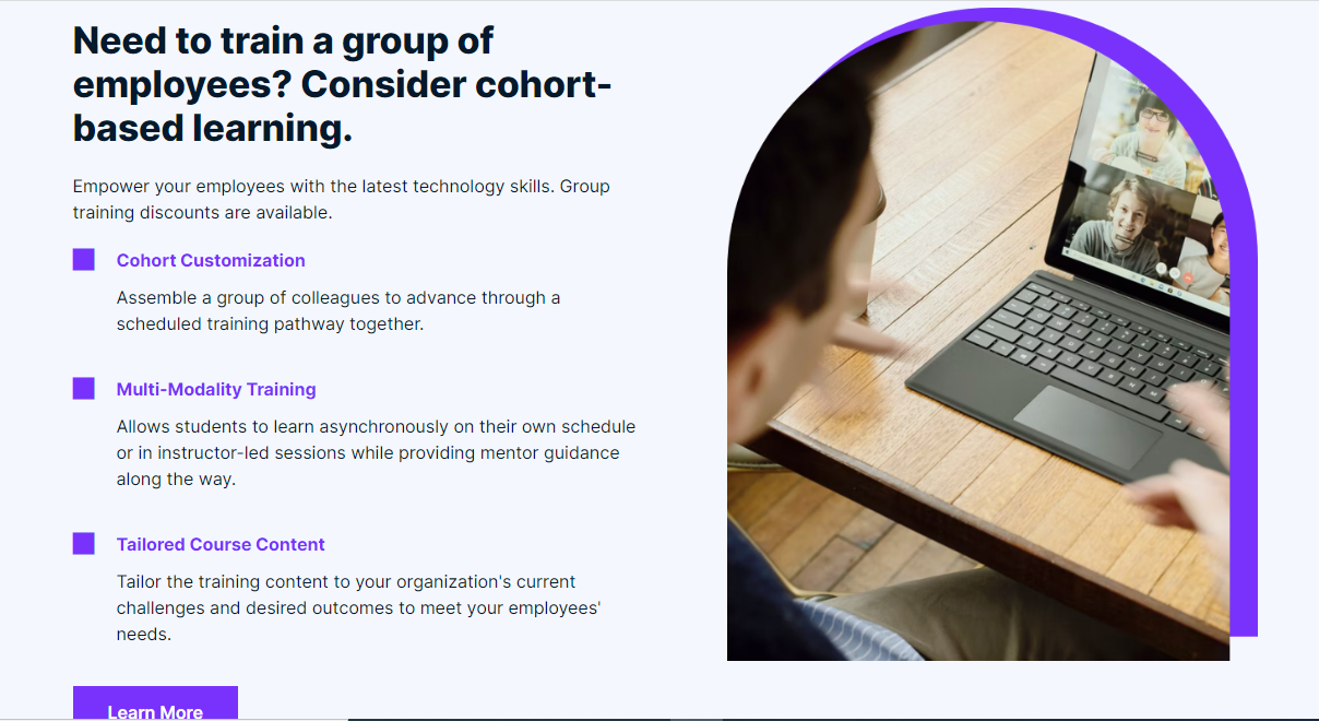 The sales page also features some of the student reviews, giving interested potential students an idea of what to expect from the course. As you scroll further down, another thing you observe is cohort-based learning, where employers can empower their staff with the latest technology skills.