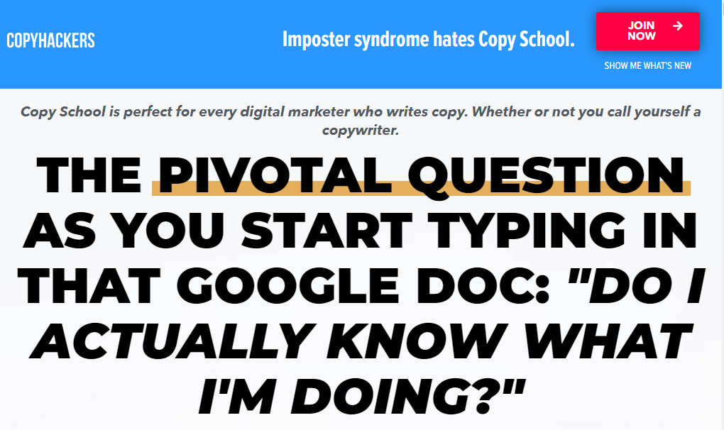 Joanna Wiebe is well-known for her Copy School Program. It's comprehensive training for digital marketers, eCommerce businesses, agencies, and anyone who writes copy, whether or not they identify as a copywriter, to help them sharpen the copy of their sales and marketing assets.