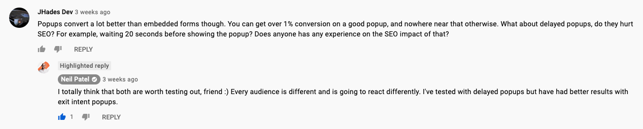 I was curious to know what works in terms of popup behavior and I've asked a question in one of the videos of a very well-known marketer called Neil Patel, that you must have found already if you are interested in these topics, and here is what I asked him: