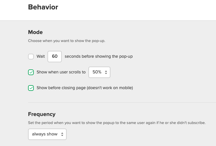 So how do you deal with this? The key is to set the behavior of the popup to only open if the user scrolls to at least 50% of the page.