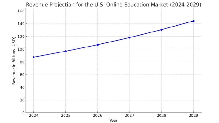 By 2025, the U.S. is set to continue leading the online education sector, with expected revenue surpassing $87.51 billion as projected for the year 2024 with an annual growth of 10.52%.